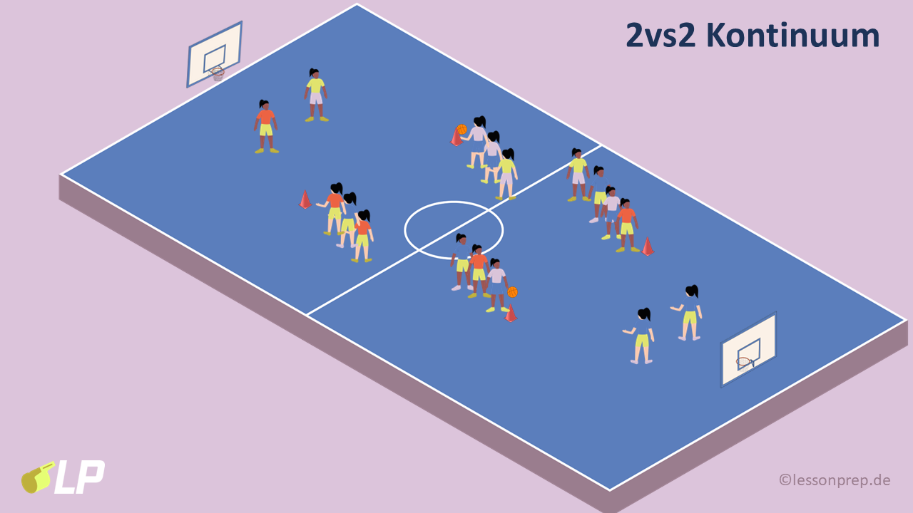 - Jeweils 2 Verteidiger stehen am Korb und versuchen den Korbwurf zu verhindern