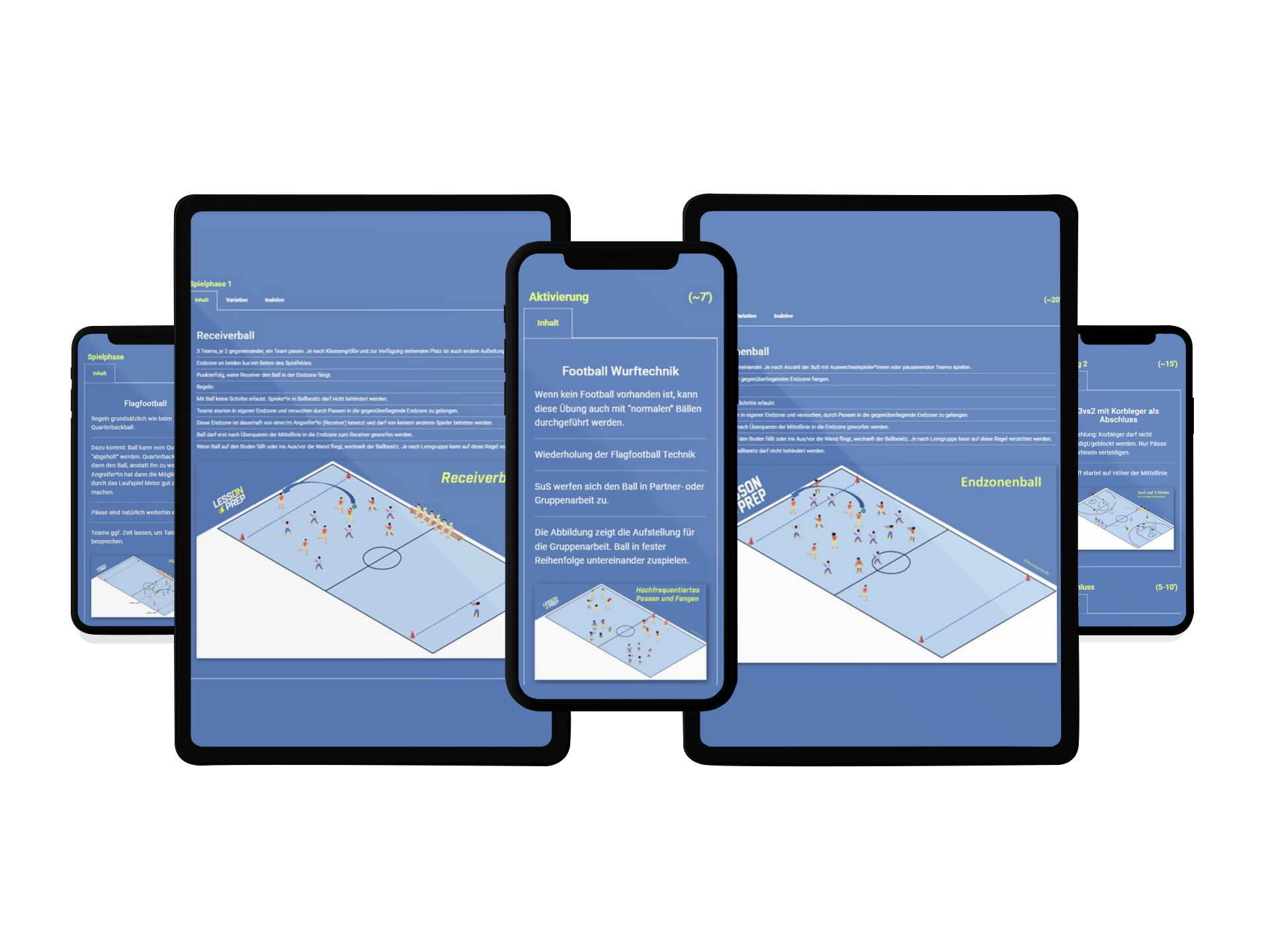 Es gibt einige vereinfachte Spielformen des Flagfootballs. Spiele wie Endzonenball, Receiverball oder Quarterbackball werden verständlich mit dem Aufbauplaner von LessonPrep erklärt.