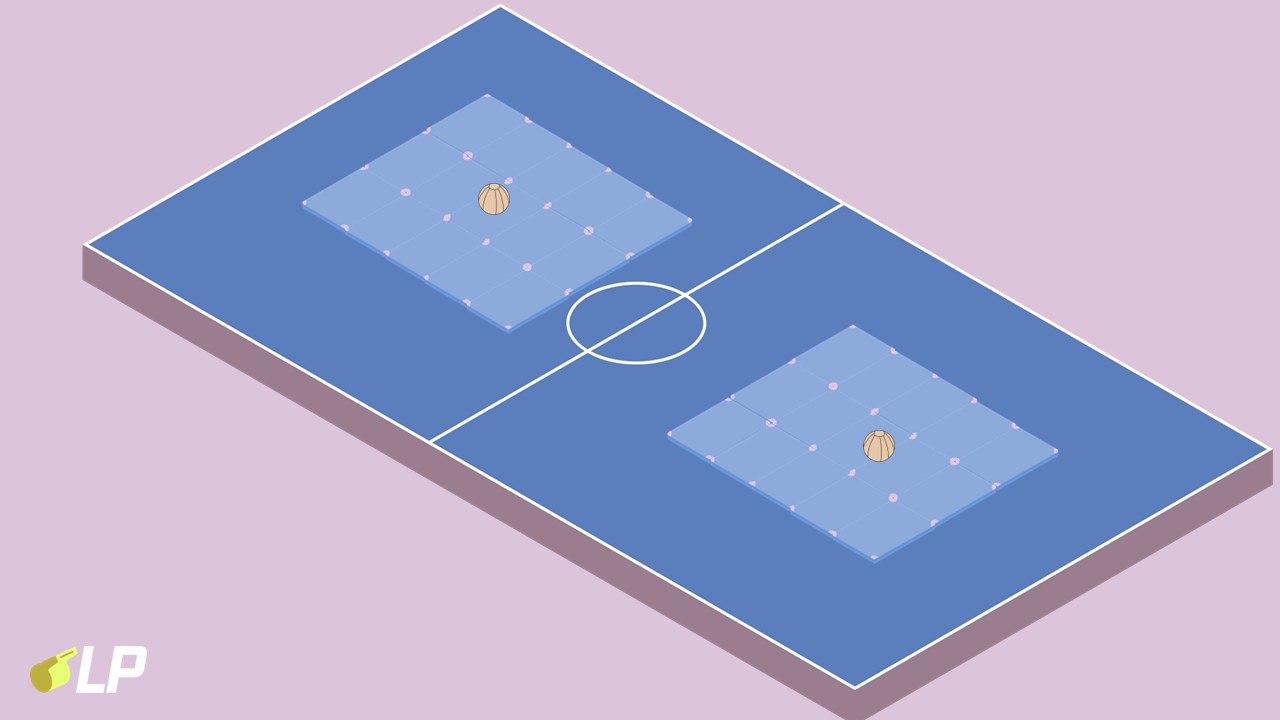 - In der Mitte jeder Mattenfläche liegt ein Medizinball.